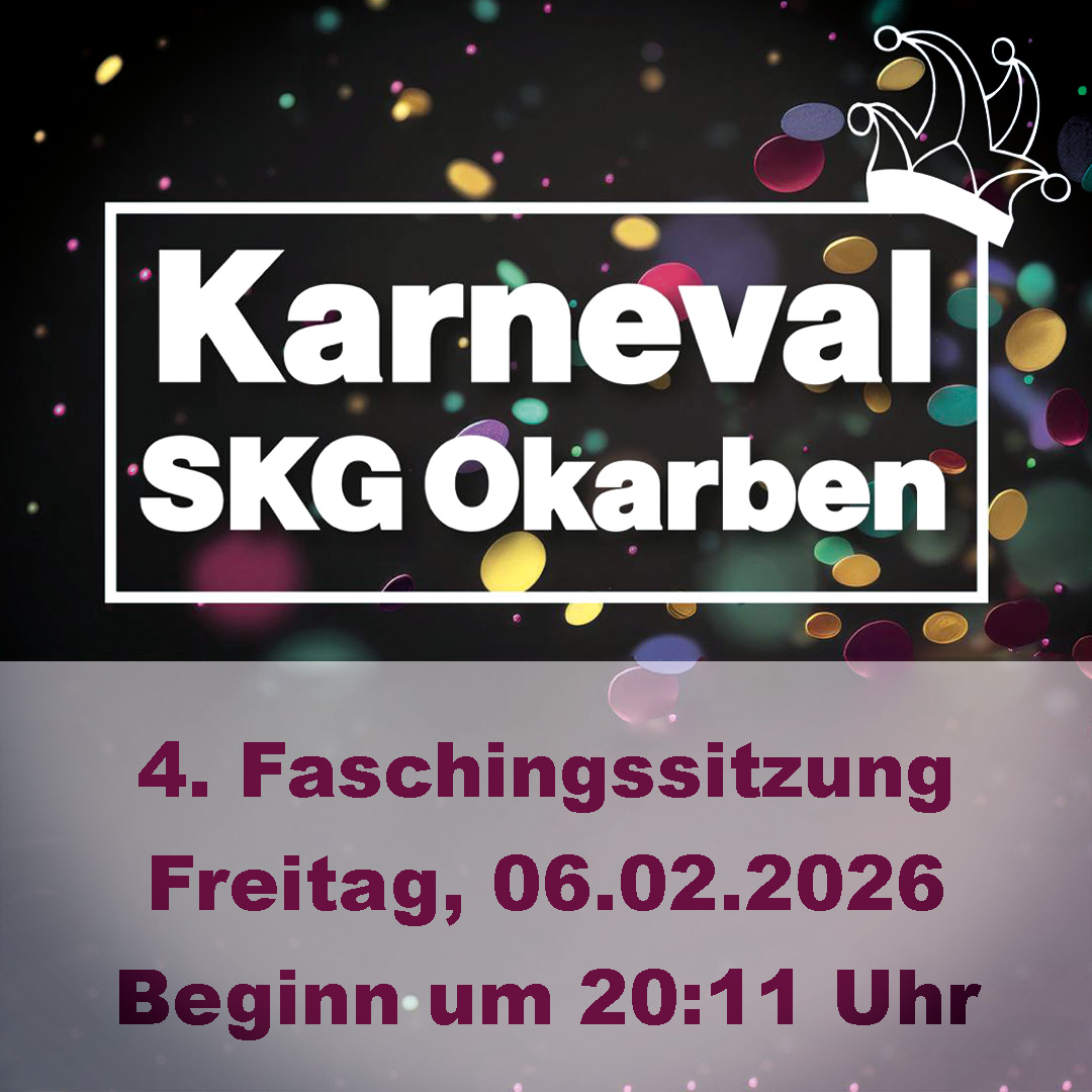 Die 4. Sitzung der SKG Okarben bietet nochmals klassische Fastnachtsunterhaltung mit Vorträgen, Tänzen und Musik. Danach heißt es: weiterfeiern bei der Aftershowparty mit DJ Rudi.