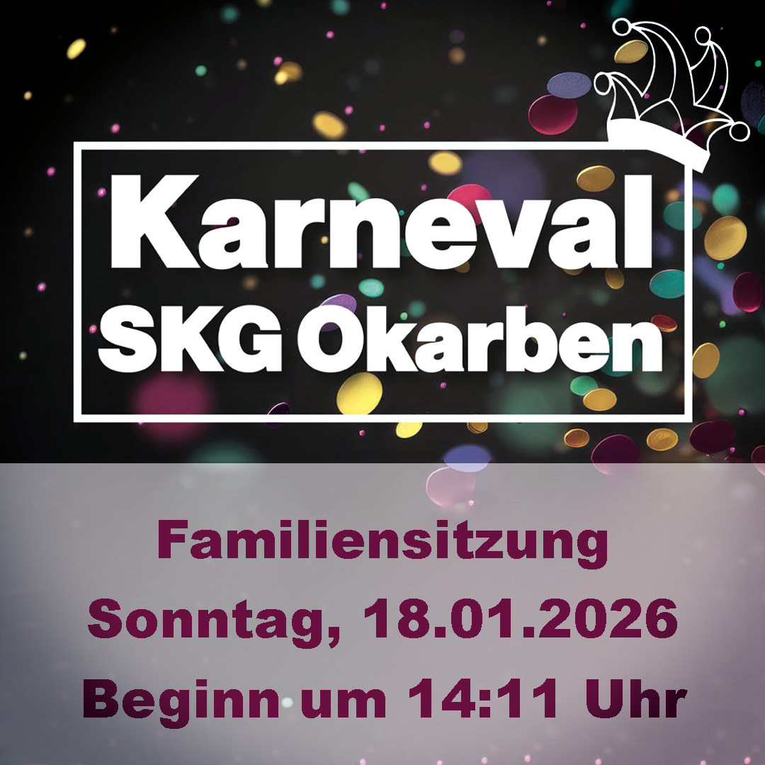 Die Familiensitzung der SKG Okarben bietet närrische Unterhaltung für Groß und Klein. Mit Tänzen, lustigen Beiträgen und einem bunten Programm ist sie der ideale Fastnachtstermin für die ganze Familie – fröhlich, abwechslungsreich und kindgerecht.